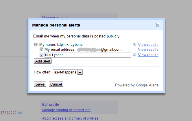 Εσείς οι ίδιοι θα ρυθμίσετε τις ειδοποιήσεις που θα λαμβάνετε, όπως και τι θα αφορούν, αν θα είναι δηλαδή το όνομά σας (με το δεδομένο ότι έχετε σχετικά σπάνιο όνομα), αλλά κυρίως τις ηλεκτρονικές σας διευθύνσεις, ή το τηλέφωνό σας.