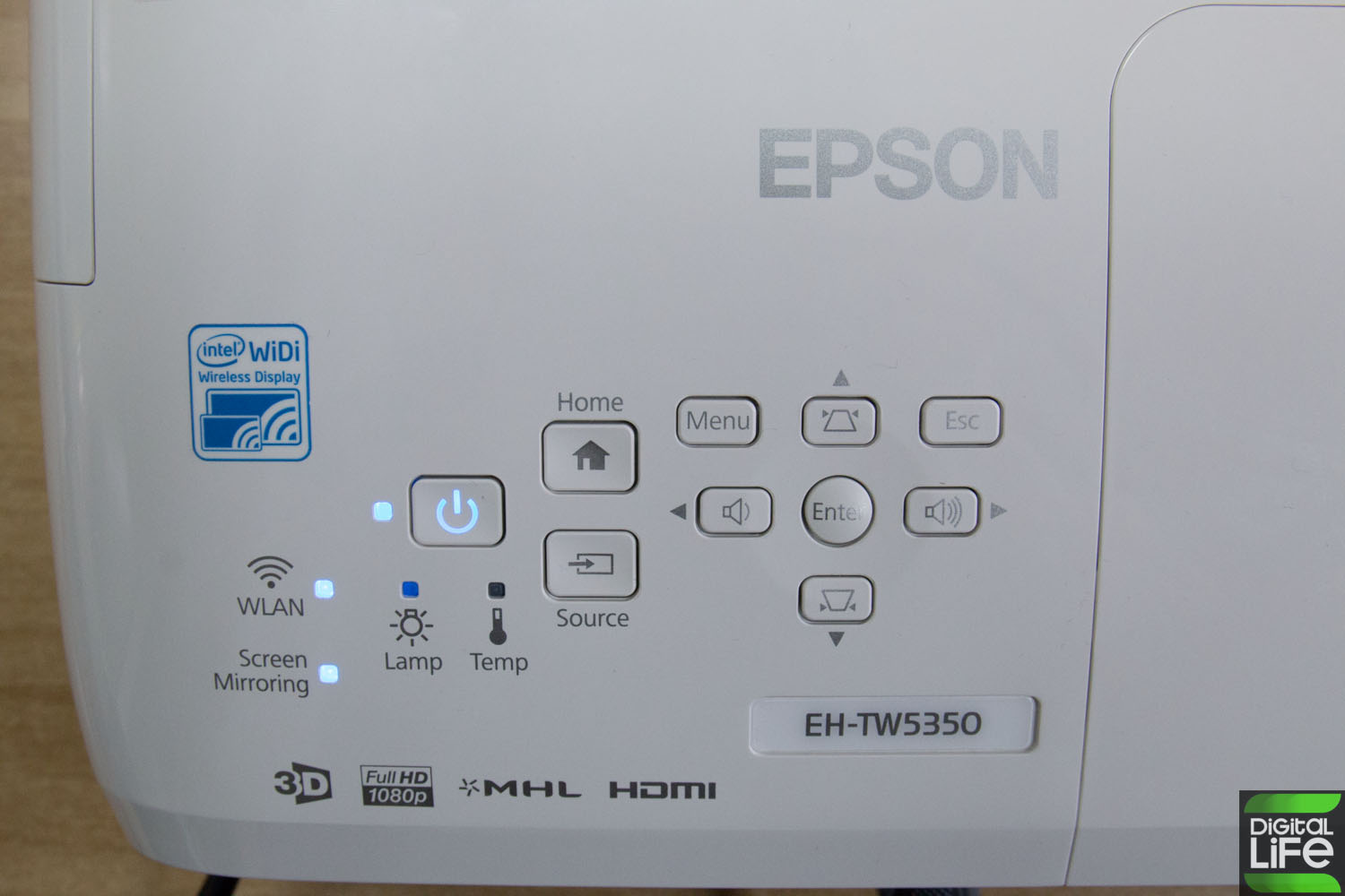 Πάνω στον Epson TW5350 θα βρείτε αρκετά πλήκτρα ελέγχου (ορισμένα φωτιζόμενα) που σας βοηθούν να ρυθμίσετε εύκολα τον προτζέκτορα, αν δε θέλετε να χρησιμοποιήσετε το παρεχόμενο τηλεχειριστήριο. Επίσης, τα sliders για την εστίαση και το keystone correction (έως 30 μοίρες στον οριζόντιο άξονα) είναι ακριβώς πάνω από το φακό και είναι πανεύκολα στη χρήση. Το σύστημα ψύξης είναι αποδοτικό αλλά και σχετικά αθόρυβο (37 dbA και 27 στο economy mode), ενώ αφαιρώντας το πλαϊνό καπάκι μπορείτε να βγάλετε και να καθαρίσετε το μικρό φίλτρο αέρα που διαθέτει.