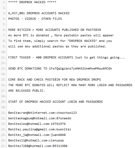 Περισσότερα από 7 εκατομμύρια usernames και passwords της δημοφιλούς cloud υπηρεσίας φαίνεται ότι έχουν αποκαλυφθεί, με 400 από αυτά να δημοσιεύονται αρχικά στο Pastebin και ακόμη περισσότερα να διαρρέουν αργότερα, μετά από bitcoin donations που ζήτησε ο hacker.