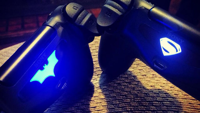 Τι είναι τα decals; Πρόκειται για μαύρα αυτοκολλητάκια με σχέδια που κολλάνε πάνω στη light bar, κάνοντας αυτό το σχήμα φωτιζόμενο. Έτσι λοιπόν μπορείς να διακοσμήσεις το DualShock 4 σου με σχεδόν ο,τι σχέδιο θες. Στη φωτογραφία παραπάνω βλέπουμε το σήμα του Batman και του Superman. Σούπερ ε; Μπορείς να βρεις με το σήμα της Sony, του PS4 και διαφόρων άλλων παιχνιδιών (FIFA, BF4, κλπ).