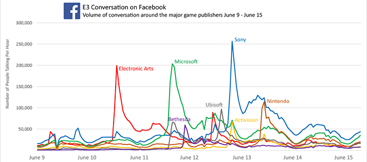 Στο διάστημα που διήρκεσε η E3 2017 από τις 10 Ιουνίου έως τις 15 Ιουνίου (η καταμέτρηση ξεκινάει από το EA PLAY event στις 10/6 και ολοκληρώνεται την τελευταία μέρα της έκθεσης στις 15/6), η Sony συζητήθηκε πιο πολύ από κάθε άλλη εταιρεία, καθώς έπιασε παραπάνω από 250.000 posts. Στη δεύτερη θέση βρέθηκε η Microsoft με περίπου 200.000 posts, ενώ σε απόσταση αναπνοής από τα 200.000 posts βρέθηκε η EA και το event της EA Play. Τέλος, στην τέταρτη θέση βρέθηκε η Nintendo με 110.000 posts. Όσον αφορά το game με τα περισσότερα posts, likes και shares ήταν το Star Wars Battlefront 2 (ανακηρύχτηκε επίσης ως το Ε3 game με τα περισσότερα views στο YouTube) με 110.000 posts, shares, comments και reactions, ενώ το ακολούθησαν τα Assassin’s Creed Origins, God of War και Spider-Man που έπιασαν κοντά στα 50.000, ενώ η Facebook «επίδοση» του Super Mario Odyssey ανήλθε στα 30.000. Εκτός από τα στατιστικά του Facebook, ένα εξίσου ενδιαφέρον στατιστικό είναι ότι στο Twitch είχαμε παραπάνω από 5.5 εκατομμύρια ώρες που σχετίζονταν με την προβολή content από την E3 2017.