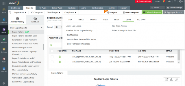 Επιπλέον, το AD360 μπορεί να ενισχύσει την ασφάλεια των προσωπικών δεδομένων των οργανισμών, ελέγχοντας τις προσπάθειες σύνδεσης για τον εντοπισμό μη εξουσιοδοτημένης πρόσβασης. Παρέχοντας ορατότητα στις πληροφορίες σύνδεσης, τις κλιμακώσεις προνομίων και άλλες ενέργειες που αφορούν στη δραστηριότητα των χρηστών, το AD360 αυξάνει την ικανότητα των οργανισμών να εντοπίζουν παραβιάσεις πληροφοριών, διασφαλίζοντας παράλληλα τη συμμόρφωση με τον GDPR.