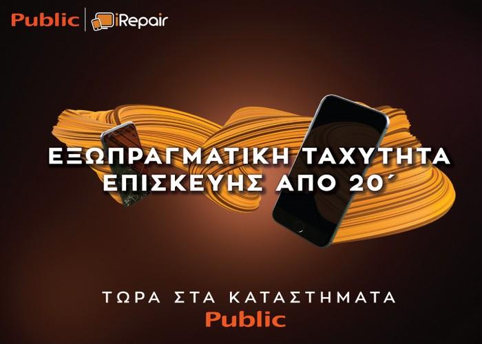 Τα Public, μέσα από τη συνεργασία τους με την iRepair, εξελίσσουν το service συσκευών και δίνουν στους λάτρεις της τεχνολογίας την ευκαιρία να ζήσουν Εξωπραγματική Ταχύτητα Επισκευής μέσα στα καταστήματα Public, μόλις από 20 λεπτά!