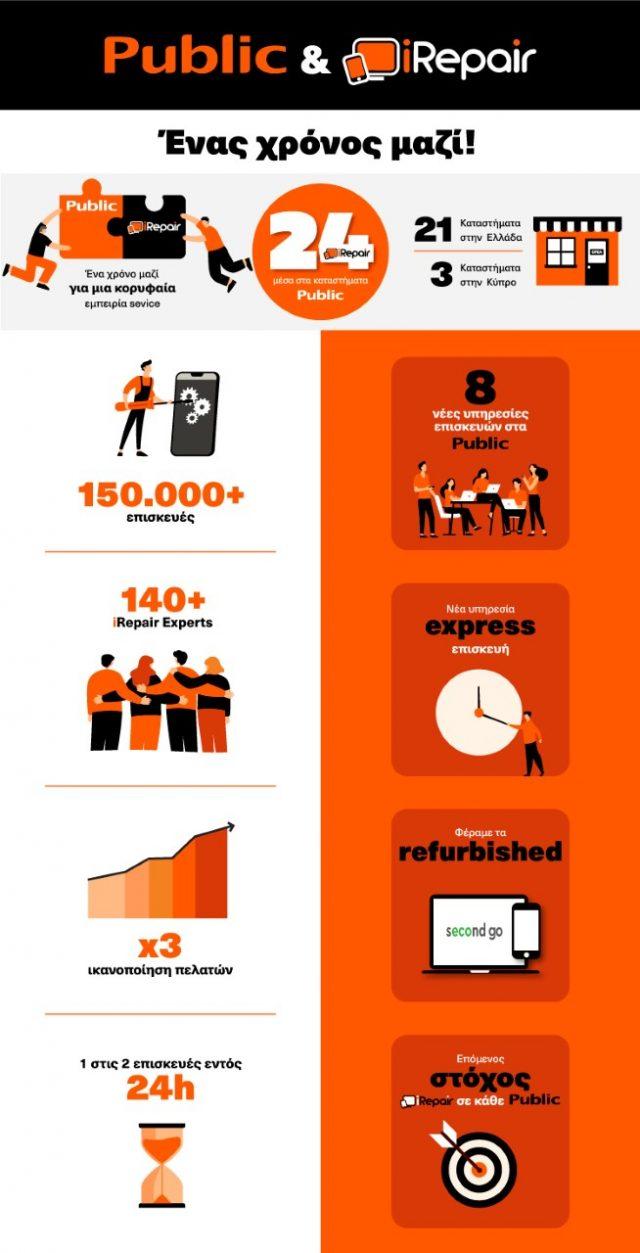Οι επισκέπτες των σημείων service iRepair εντός των καταστημάτων Public έχουν πλέον πρόσβαση σε μία ολοκληρωμένη γκάμα υπηρεσιών τεχνικής υποστήριξης και επισκευής συσκευών τεχνολογίας που καλύπτουν smartphone, iPhone , tablet, laptop και desktop συσκευές με ευκολία για τον πελάτη, άμεση επισκευή, και υψηλή ποιότητα, χάρη στην εξειδικευμένη ομάδα της iRepair.