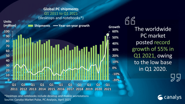 Συνεχίζει και το 2021 η παγκόσμια αγορά ηλεκτρονικών υπολογιστών να κινείται σε ανοδική τριχιά, καταρρίπτοντας μάλιστα το ένα ρεκόρ μετά το άλλο. Πιο συγκεκριμένα, το 1ο τρίμηνο του τρέχοντος έτους, οι πωλήσεις αυξήθηκαν, σε παγκόσμιο επίπεδο, κατά 55% σε ετήσια βάση, αγγίζοντας τα 82,7 εκατ. τεμάχια. Πρόκειται για την ισχυρότερη επίδοση, που έχει σημειωθεί στις πωλήσεις σταθερών και φορητών ηλεκτρονικών υπολογιστών, τα τελευταία εννέα χρόνια. Σύμφωνα με τους αναλυτές της Canalys, οι ανεκτέλεστες παραγγελίες του 2020, ειδικά για φορητούς υπολογιστές, ήταν ο βασικός παράγοντας για την ισχυρή άνοδο των πωλήσεων κατά το 1ο τρίμηνο του 2021. Μάλιστα, οι πωλήσεις στις επιμέρους προϊοντικές κατηγορίες της αγοράς των ηλεκτρονικών υπολογιστών δίνουν ακόμη πιο εντυπωσιακά ευρήματα.