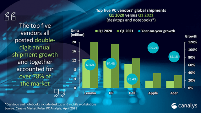 Η HP κατέλαβε τη δεύτερη θέση της παγκόσμιας αγοράς με συνολικές αποστολές 19,2 εκατομμυρίων μονάδων, που συνιστά αύξηση κατά 64% έναντι του 1ου τριμήνου του 2020. Η Dell βρέθηκε για το εξεταζόμενο διάστημα στην τρίτη θέση της παγκόσμιας αγοράς, αυξάνοντας τις πωλήσεις της κατά 23% από έτος σε έτος, οι οποίες ανήλθαν σε 12,9 εκατομμύρια μονάδες.