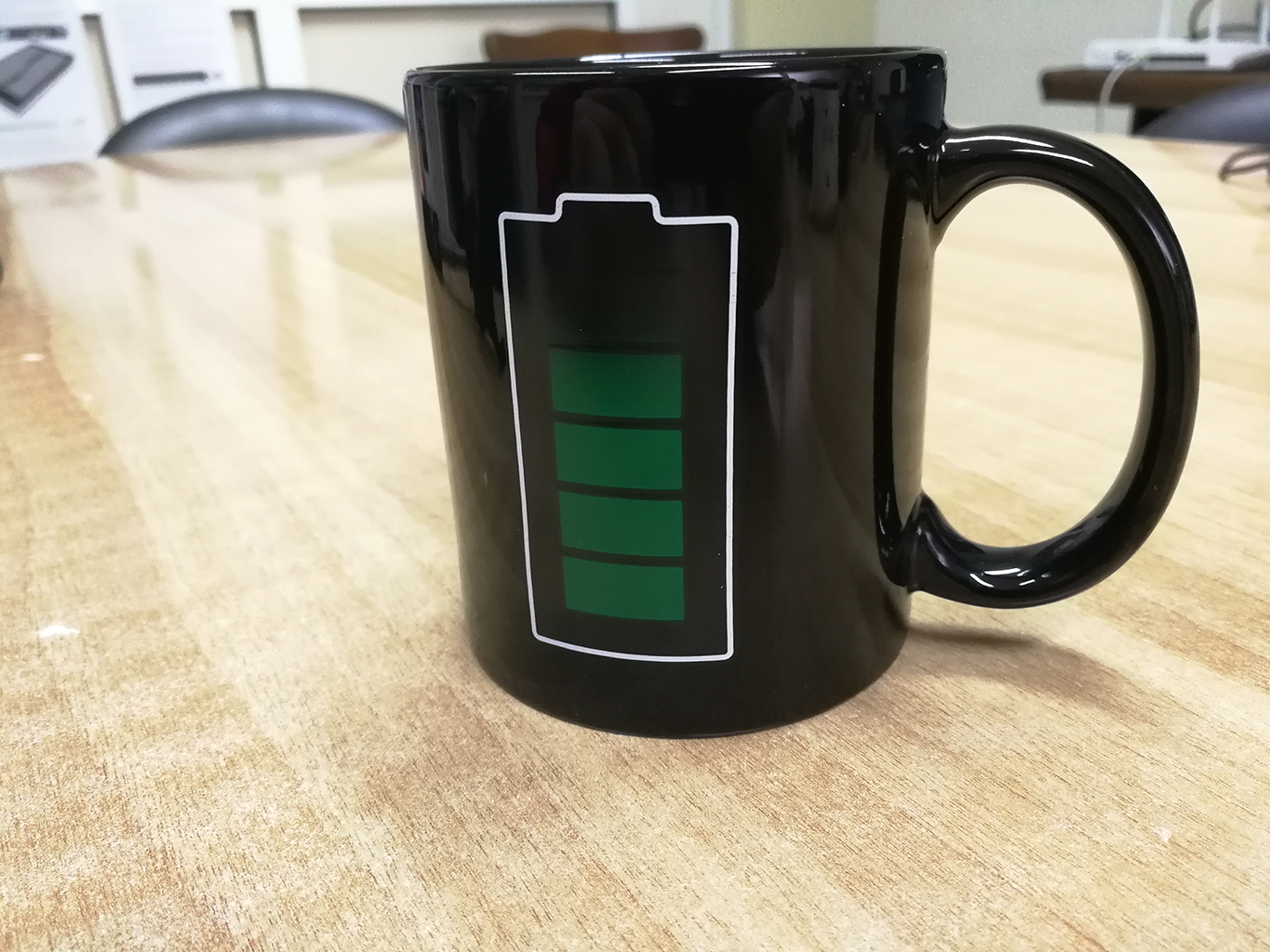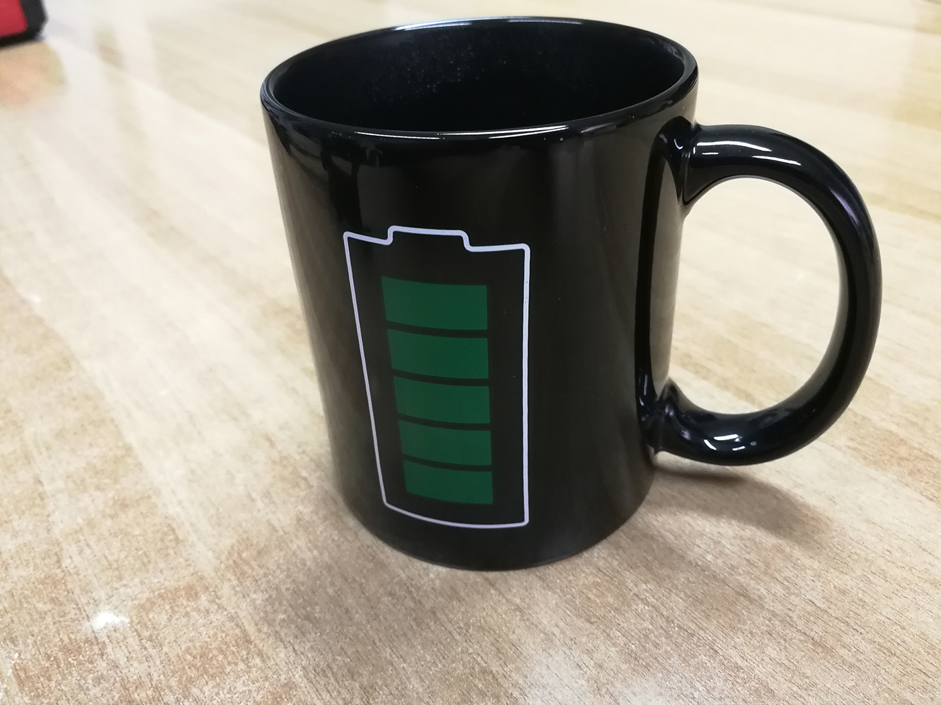 Το θερμικό αυτοκόλλητο που σχηματίζει την “μπαταρία” είναι ειδικά κατασκευασμένο ώστε να παραμένει μαύρο όταν η κούπα είναι άδεια ή περιέχει κρύο υγρό, αλλά μόλις ένα ζεστό ρόφημα την γεμίσει, τότε τα θερμοευαίσθητα “κουτάκια” της μπαταρίας παίρνουν πράσινο χρώμα και αρχίζει η… φόρτιση!