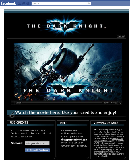 H Warner Bros επιτρέπει πλέον στους χρήστες του Facebook να ενοικιάζουν ταινίες μέσα από το δημοφιλές social network. Συγκεκριμένα, οι χρήστες θα μπορούν να χρησιμοποιούν τα “Facebook Credits” –έναν τρόπο πληρωμής που χρησιμοποιείται και σε πολλά δημοφιλή παιχνίδια του Facebook όπως το FarmVille και το Mafia Wars– και να ενοικιάζουν για ένα διάστημα ταινίες μέσα από τις επίσημες fan pages τους. Η νέα υπηρεσία θα ξεκινήσει να λειτουργεί άμεσα, με το φιλμ “The Dark Knight”, που θα μπορούν να “νοικιάσουν” οι χρήστες για 48 ώρες έναντι 30 Facebook Credits ή περίπου €2.14, ενώ θα συνεχιστεί και με άλλες ταινίες. Προς το παρόν βέβαια, η δυνατότητα αυτή θα είναι διαθέσιμη μόνο στις Ηνωμένες Πολιτείες.