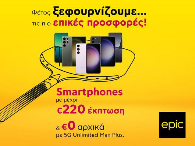 H Epic υποδέχεται το Πάσχα με νέες εμπορικές προσφορές, δίνοντας τη δυνατότητα σε όλους να αποκτήσουν τα πιο hot smartphones με €0 αρχικά και έκπτωση μέχρι €220 μαζί με πλάνο 5G Unlimited Max Plus και μάλιστα με ένα εκπληκτικά χαμηλό μηνιαίο πάγιο. Σε ό,τι αφορά την επιλογή συσκευών, οι ενδιαφερόμενοι μπορούν να επιλέξουν μέσα από μία μεγάλη ποικιλία smartphones όπως: το iPhone 14 Pro Max 128GB, το Samsung Galaxy S23 Ultra 256 ή το Xiaomi 13 Pro 256GB.