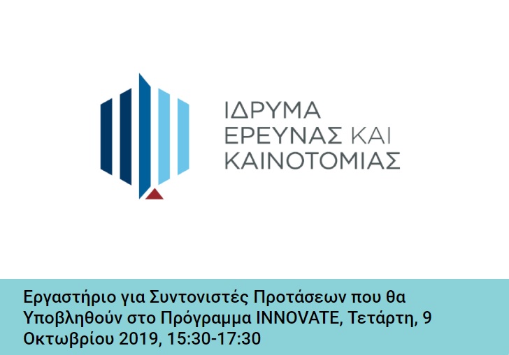 Εργαστήριο που απευθύνεται σε άτομα που θα αναλάβουν, ως Συντονιστές, την υποβολή προτάσεων στο Πρόγραμμα «Ανάπτυξη και Προώθηση Διεθνώς Ανταγωνιστικών Καινοτόμων Προϊόντων και Υπηρεσιών από Υφιστάμενες Επιχειρήσεις (Innovate)» διοργανώνει το Ίδρυμα Έρευνας και Καινοτομίας (ΙδΕΚ).