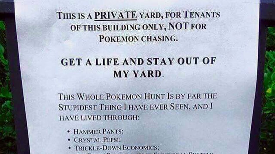 Με το GPS και τα data ανοικτά, το augmented reality game το οποίο ακούς συνέχεια τις τελευταίες ημέρες έχει αναστατώσει πολύ κόσμο, υπάρχουν ωστόσο και αυτοί που δε θέλουν ούτε να ακούν γι’ αυτό. Εκνευρίζονται όμως και που βλέπουν κόσμο να ψάχνει για Pokemon παντού. Και κάπου εδώ έρχεται η ακόλουθη φωτογραφία, μία ανακοίνωση σε τυπωμένο χαρτί Α4 που κάποιος έβαλε έξω από το σπίτι του.