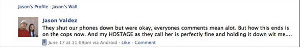 Όλα ξεκίνησαν στις 17 Ιουνίου, όταν η αστυνομία στο Ogden των Ηνωμένων Πολιτειών προσπάθησε να συλλάβει τον Jason Valdez, καθώς δεν είχε εμφανιστεί στο δικαστήριο όπως έπρεπε. Ο ίδιος, στη συνέχεια, κλείστηκε σε ένα δωμάτιο ενός ξενοδοχείου, ενημερώνοντας το facebook profile του, μέσω του κινητού του τηλεφώνου, για την κατάσταση στην οποία βρισκόταν. Ο Valdez έκανε 6 status updates, σε κάποια από τα οποία, μάλιστα, ανέφερε μία γυναίκα, τη Veronica, την οποία είχε μαζί του ως όμηρο.