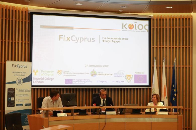 Σε λειτουργία τέθηκε από σήμερα η νέα εφαρμογή για κινητά τηλέφωνα FixCyprus, που αναπτύχθηκε στο πλαίσιο συνεργασίας του Τμήματος Δημοσίων Έργων του Υπουργείου Μεταφορών, Επικοινωνιών και Έργων και του Κέντρου Αριστείας «Κοίος», με σκοπό να συμβάλει στη βελτίωση της υποδομής του οδικού δικτύου και ενίσχυση της οδικής ασφάλειας.