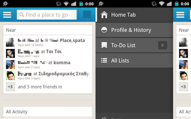 Αρχικά, στη νέα εμφάνιση θα παρατηρήσετε στο πάνω αριστερό μέρος ένα γνωστό εικονίδιο, αυτό με τις τρεις οριζόντιες γραμμές, το οποίο ανοίγει το μενού του Foursquare και θυμίζει το αντίστοιχο εικονίδιο της Facebook εφαρμογής. Μπορείτε να ανοίξετε το μενού και σέρνοντας την οθόνη από τα αριστερά προς τα δεξιά. Εκεί θα βρείτε τις ρυθμίσεις του λογαριασμού σας, τις λίστες To-Do και άλλες επιλογές.