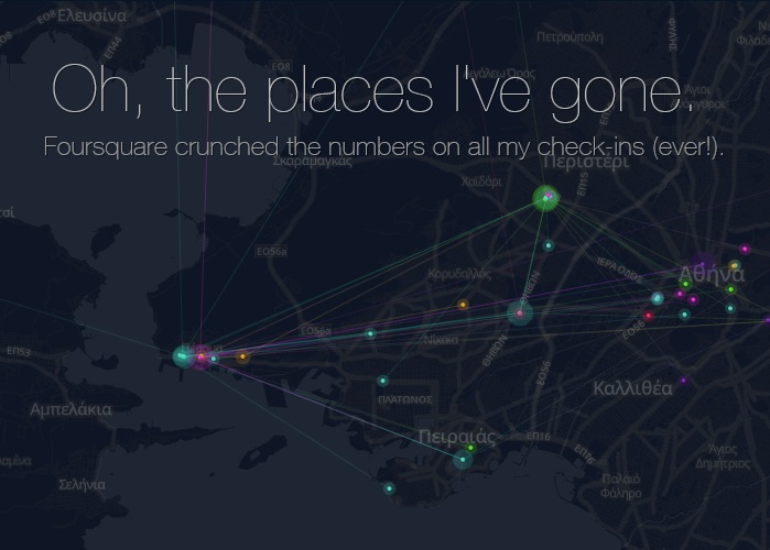 Αφού λοιπόν είδες τα μέρη στα οποία έχεις βρεθεί, το Foursquare στο 2ο βήμα θα σου προτείνει κάποια ακόμη να επισκεφτείς και στο 3ο βήμα, το καλύτερο κατά τη γνώμη μου, θα σου δημιουργήσει αυτόματα το δικό σου Infographic! Όλες οι πληροφορίες που μπορείς να συλλέξεις από τα check-in σου, πάνω σε μία εικόνα! Φοβερό ε; Ακόμη να το δοκιμάσεις;