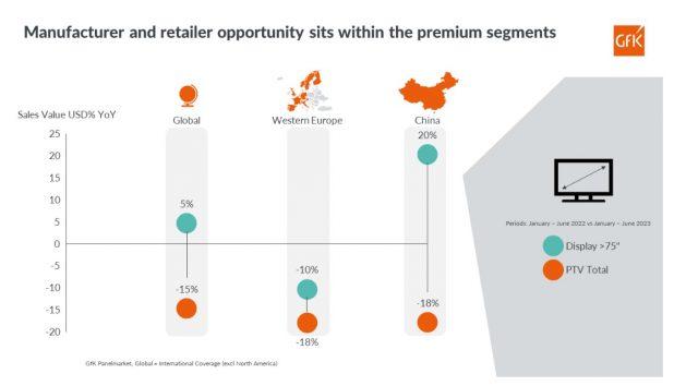Αντιμέτωπη με την πτώση της ζήτησης βρίσκεται και η αγορά των συσκευών τηλεόρασης. Στην πραγματικότητα, τα έσοδα μειώθηκαν με ταχύτερο ρυθμό απ’ ό,τι το σύνολο της αγοράς. Ειδικότερα, οι πωλήσεις περιορίστηκαν κατά 15% μεταξύ Ιανουαρίου και Ιουνίου 2023, σε σύγκριση με την ίδια περίοδο πέρυσι. Το 2022, οι premium τηλεοράσεις ήταν ο μεγάλος πρωταγωνιστής της αγοράς, με τα μοντέλα υψηλής τεχνολογίας να είναι η μόνη κατηγορία, που συνέχισε να αναπτύσσεται σε όλο τον κόσμο. Η εικόνα φέτος είναι πολύ διαφοροποιημένη καθώς οι premium τηλεοράσεις εξακολουθούν μεν να έχουν καλύτερες επιδόσεις από τον μέσο όρο της αγοράς, ωστόσο, δεν καταφέρνουν πλέον να σημειώνουν θετική ανάπτυξη σε ορισμένες περιοχές του κόσμου όπως η Δυτική Ευρώπη.