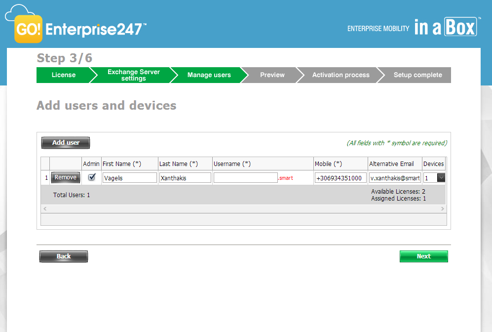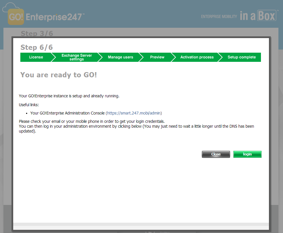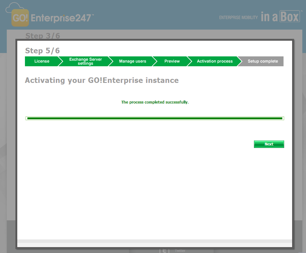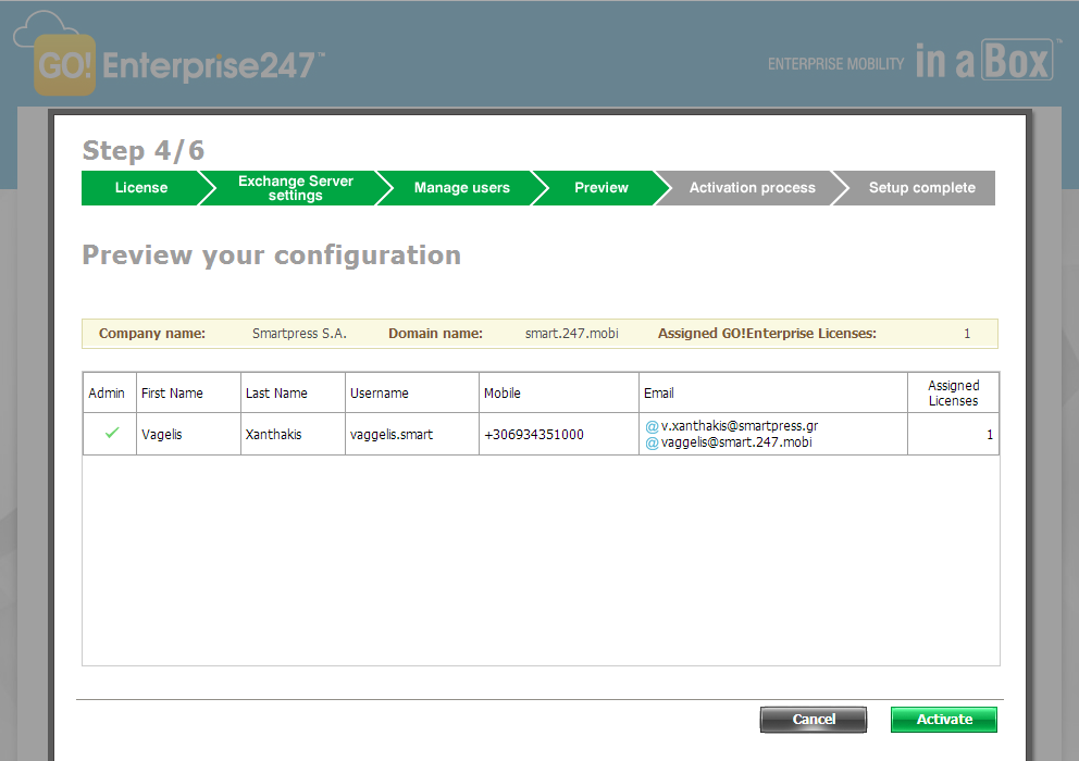 Όπως είπαμε και παραπάνω, το μόνο που χρειάζεστε είναι ο 16ψηφιος κωδικός. Αφού λοιπόν μπείτε στο url ‘goentrerpise247.com’ θα εμφανιστεί το σχετικό prompt και θα αρχίσει το setup της υπηρεσίας. Η εγκατάσταση ξεκινά αυτόματα και σε μερικά λεπτά θα είστε ο διαχειριστής της πλατφόρμας που θα έχει πλέον δημιουργήσει τις απαραίτητες θέσεις στους servers της GLOBO για το mail σας και για τον αποθηκευτικό σας χώρο. Εδώ θα πρέπει να τονίσουμε ότι στην τιμή/πακέτο περιλαμβάνονται premium υπηρεσίες email μέσω του Microsoft Exchange Mail Server.