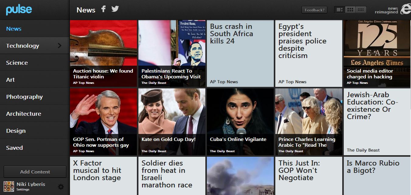 Pulse: Το pulse είναι ένα πανέμορφο reader (βλέπετε photo), έχει βραβευτεί για το design του, με την διαφορά, όμως, πως το μόνο που επιλέγετε εσείς είναι κατηγορίες ενημέρωσης. Δεν μπορείτε, δηλαδή, να ενημερώσετε την εφαρμογή για το ποιο site σας ενδιαφέρει περισσότερο. Αν και είναι εξαιρετικά καλοφτιαγμένο, αν δεν είστε fan των mainstream, ή δεν είστε αποκλειστικά προσηλωμένος στα Αμερικανικά ΜΜΕ, δεν θα σας βοηθήσει ιδιαίτερα.