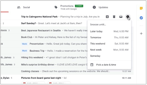 Η νέα μορφή του Gmail σας βοηθά να κάνετε περισσότερα πράγματα. Να επιλέξετε συνημμένα -όπως φωτογραφίες- χωρίς να χρειαστεί να ανοίξετε ή να ανατρέξετε σε μεγάλες συνομιλίες, να χρησιμοποιήσετε το νέο πλήκτρο snooze για να αναβάλετε την ανάγνωση emails που δε χρειάζεται να δείτε αμέσως ή να έχετε εύκολη πρόσβαση σε άλλες εφαρμογές που χρησιμοποιείτε συχνά, όπως το Google Calendar, το Tasks, (τώρα διαθέσιμο σε Android και iOS) και το Keep.