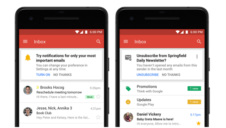 Νέες λειτουργίες στις φορητές συσκευές, όπως οι ειδοποιήσεις υψηλής προτεραιότητας, θα μπορούν να σας ενημερώνουν για σημαντικά εισερχόμενα μηνύματα, χωρίς να χρειαστεί να διακόπτετε αυτό που κάνετε εκείνη τη στιγμή. Επιπλέον, το Gmail θα αρχίσει να σας προτείνει το πότε να καταργήσετε την εγγραφή σας από ενημερωτικά δελτία (newsletters) ή προσφορές που έχουν πάψει να σας ενδιαφέρουν.