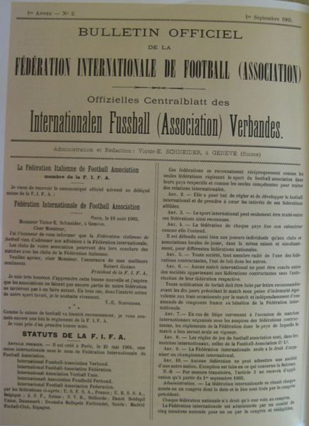 Στις 21 Μαΐου του 1904, έξι ποδοσφαιρικές ομοσπονδίες, της Γαλλίας, του Βελγίου, της Δανίας, της Ολλανδία, της Σουηδίας, της Ελβετίας καθώς και εκπρόσωποι της Ρεάλ Μαδρίτης για λογαριασμό της Ισπανίας, ίδρυσαν την Παγκόσμια Ομοσπονδία Ποδοσφαίρου (FIFA), με πρώτο πρόεδρο τον Γάλλο δημοσιογράφο, Robert Guérin.