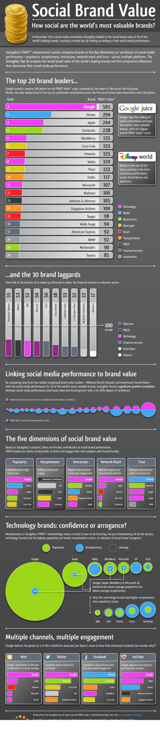 Το πόσο κοινωνικά είναι τα “brands”, οι επωνυμίες δηλαδή των εταιριών, σημαίνει πόση απήχηση έχει στους ανθρώπους η παρουσία αυτών των brands στα κοινωνικά δίκτυα. Η απήχηση αυτή μετρήθηκε από την εταιρία Sociagility και η μέτρηση βασίστηκε σε 5 παράγοντες: το πόσο δημοφιλείς είναι, πώς δέχονται οι χρήστες την παρουσία τους, την αλληλεπίδραση των brands με τους χρήστες, την απήχηση που έχουν με τα επί μέρους δίκτυα των χρηστών, αλλά και την εμπιστοσύνη. Όλα αυτά τα στοιχεία μετρώνται σε όλες τις κοινωνικές πλατφόρμες, συνολικά, συμπεριλαμβανομένων του Twitter, του Facebook και του Youtube.
