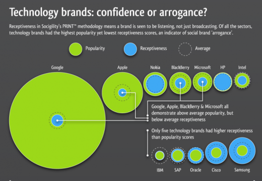 Θα δείτε το εξαιρετικά ενδιαφέρον infographic παρακάτω, αλλά εμείς θα μείνουμε σε ένα σημείο που μας ενδιαφέρει περισσότερο: Όσο κι αν οι εταιρίες τεχνολογίας φαίνονται να είναι εξαιρετικά δημοφιλείς στα κοινωνικά δίκτυα, οι ίδιες εταιρίες φαίνεται να είναι εκείνες που “ακούν” λιγότερο τους χρήστες των κοινωνικών δικτύων. Η Google, παραδείγματος χάριν, ενώ είναι η πιο δημοφιλής εταιρία σε όλο το φάσμα, είναι και εκείνη που δείχνει την λιγότερη ευαισθησία σε ότι έχει να της πει ο κάθε χρήστης για τις υπηρεσίες της. Δεν ισχύει το ίδιο για την Nokia ή την HP όμως, που σύμφωνα με την έρευνα της Sociagility, είναι από τις εταιρίες που η ανταπόκρισή τους στους χρήστες των κοινωνικών δικτύων είναι σχεδόν ανάλογη με το πόσο δημοφιλείς είναι.