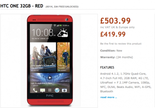 Το κόκκινο HTC One έχει διαρρεύσει, άλλωστε, και παλαιότερα τόσο στην αμερικανική σελίδα της εταιρείας (απ’ όπου και απομακρύνθηκε γρήγορα) όσο και στη σελίδα ενός online retailer στην Αγγλία, της Handtec όπως βλέπουμε και στην πιο πάνω φωτό.