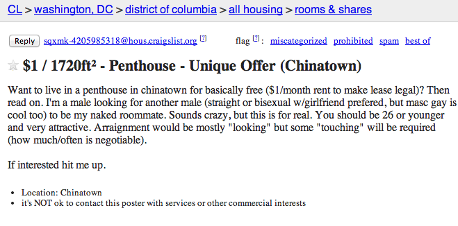 Ευκαιριάρα, αλλά, όπως αναφέρει και το Gawker, ο ενδιαφερόμενος θα πρέπει να ζητήσει κάποιες διευκρινίσεις. Για παράδειγμα, “όταν λέμε γυμνός εννοούμε… εντελώς;” “Το σπίτι θα έχει επαρκή θέρμανση;” …και άλλα ανάλογα ερωτήματα που μπορεί να κάνει κάποιος που θέλει να τρολάρει μέχρι θανάτου την αγγελία. Εδώ που τα λέμε, μεταξύ μας, είναι και το καλύτερο που μπορεί να κάνει κάποιος διαβάζοντας κάτι τέτοιο…