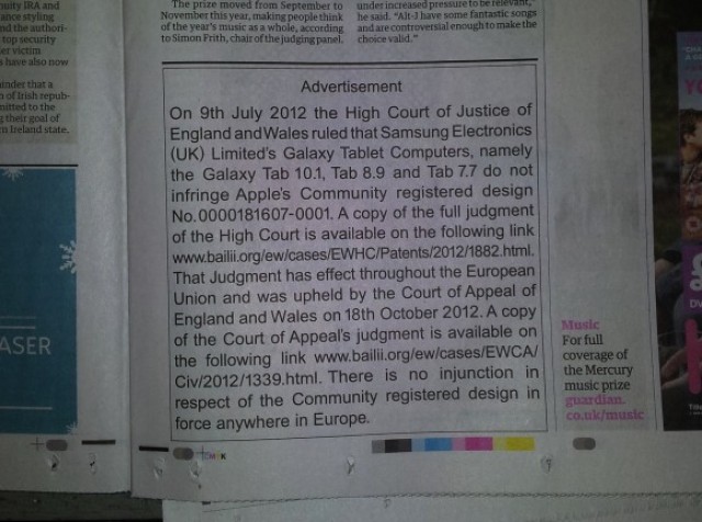 Η Apple υποχρεώθηκε να τοποθετήσει τη “δημόσια απολογία” της προς τη Samsung και σε αγγλικές εφημερίδες. Ήδη, τα σημερινά φύλλα της “DailyMail” και της “Guardian” περιλαμβάνουν την απολογία που φαίνεται ότι θα τοποθετηθεί σε ακόμη περισσότερες εφημερίδες.