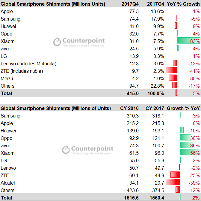 Η Apple εκθρόνισε τη Samsung από τη θέση του μεγαλύτερου κατασκευαστή στον κόσμο για το τέταρτο τρίμηνο του προηγούμενου έτους, σύμφωνα με τα στοιχεία της Counterpoint, πετυχαίνοντας αποστολές 77,3 εκατ. iPhone έναντι 74,4 εκατ. μοντέλων της Samsung.