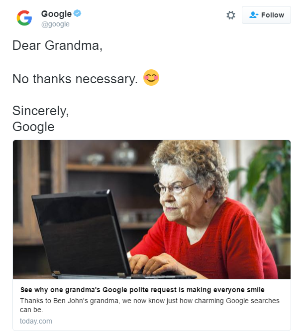 Viral έγινε τις τελευταίες μέρες μία γιαγιά online για το “δικό” της ευγενικό τρόπο, με τον οποίο ζήτησε από την Google κάτι μέσω της αναζήτησης.