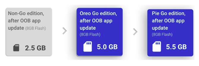 Η Google αναφέρει ότι το νέο λειτουργικό, πέρα από ταχύτερους χρόνους εκκίνησης, καλύτερες δυνατότητες ασφαλείας και ένα νέο dashboard, προσφέρει 500MB περισσότερο αποθηκευτικό χώρο στους χρήστες του από τον προκάτοχό του Android Oreo Go Edition. Συγκριτικά, ένα τυπικό Android OS απαιτεί 5,5GB από ένα flash drive 8GB για την εγκατάσταση, το Android Oreo Go Edition απαιτούσε 3GB, ενώ το Android Pie Go Edition μόλις 2.5GB χώρου, αφήνοντας το 70% του δίσκου ελεύθερο.