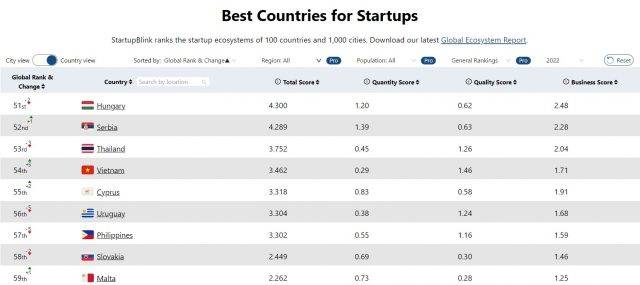 Σύμφωνα με “Startup Blink Global Ecosystem Report 2022”, που χαρτογραφεί 100 startup οικοσυστήματα και 1.000 πόλεις σε 100 χώρες ανά τον κόσμο, η Κύπρος ανέβηκε το 2022 κατά 2 θέσεις σε σύγκριση με το 2021, και κατατάσσεται στην 55η θέση στην παγκόσμια κατάταξη.