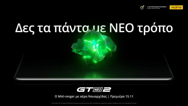 Η realme, η ταχύτερα αναπτυσσόμενη εταιρεία smartphone παγκοσμίως και μια από τις έξι κορυφαίες εταιρείες smartphone στον κόσμο, φέρνει στην Ελλάδα το realme GT NEO 2, στις 15 Νοεμβρίου.