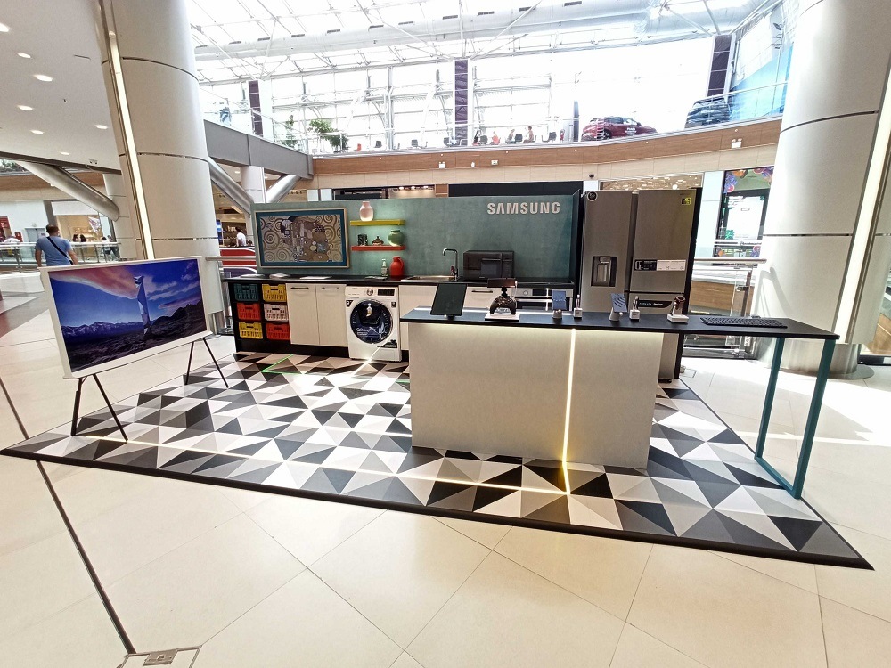 Οι οικιακές συσκευές που βρίσκονται στο booth της Samsung στο The Mall Athens πλαισιώνονται από τις Lifestyle TVs της εταιρείας, The Frame και The Serif.