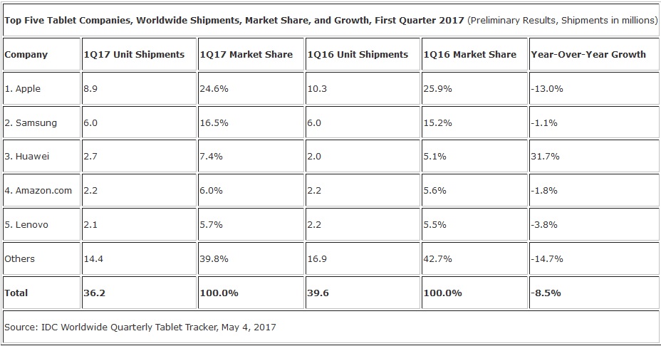 Σύμφωνα με τα στοιχεία της IDC, οι συνολικές πωλήσεις tablets το πρώτο τρίμηνο του 2017 άγγιξαν τα 36,2 εκατομμύρια μονάδες, ενώ το αντίστοιχο τρίμηνο του 2016 ήταν 39,6 εκατομμύρια (-8,5%). Αναλύοντας τα αποτελέσματα, βλέπουμε ότι τη μεγαλύτερη πτώση γνώρισε η Apple με το iPad, καθώς από τα 10,3 εκατομμύρια μονάδες, πούλησε μόλις 8,9 εκατομμύρια, μια πτώση της τάξης του 13%. Ωστόσο, παραμένει πρώτη στην αγορά με μερίδιο 24,6%, μακριά από τη 2η Samsung που έχει το 16,5% της “πίτας” και 6 εκατομμύρια πωλήσεις, ακριβώς τις ίδιες με το Q1 2016! Οι Κορεάτες αύξησαν το μερίδιό τους, καθώς η αγορά μίκρυνε.