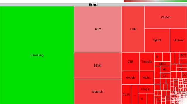 Εξετάζοντας την κατανομή των συσκευών στα διαγράμματα -που μπορείτε να δείτε αναλυτικά εδώ μαζί με κάποια άλλα ενδιαφέροντα δεδομένα- αξίζει να δοθεί έμφαση στο εντυπωσιακό κομμάτι που καταλαμβάνει η Samsung, αντιπροσωπεύοντας το 40% του συνόλου, ενώ μόνο του το Samsung Galaxy S II το 10%.