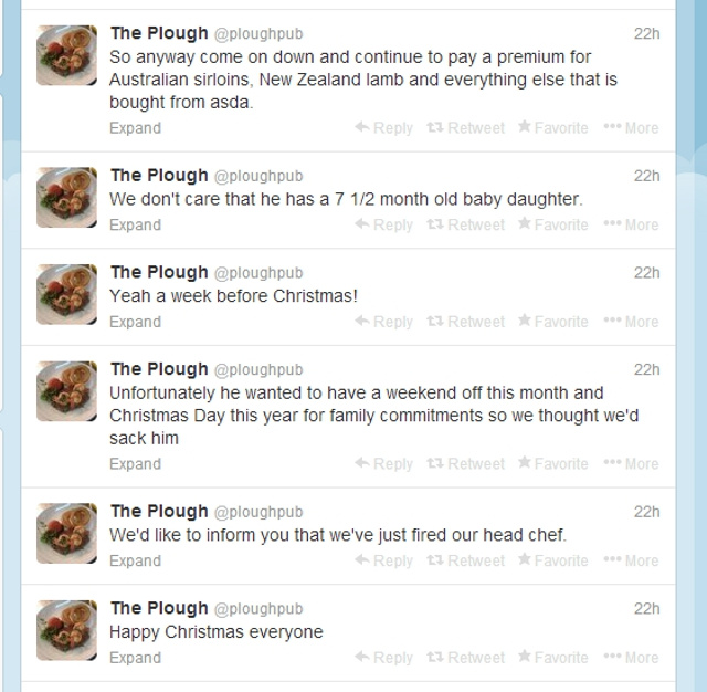 Όλα ξεκίνησαν όταν οι ιδιοκτήτες του εστιατορίου “Plough Pub” στο Oxfordshire, απέλυσαν τον Knight λίγες μέρες πριν τις γιορτές, καθώς εκείνος ήθελε να περάσει την ημέρα των Χριστουγέννων με την οικογένειά του και την 7 1/2 μηνών κόρη του και όχι δουλεύοντας, όπως του είχαν ζητήσει να κάνει “την τελευταία σχεδόν στιγμή”. Έτσι εκείνος βρήκε τον τρόπο να τους εκδικηθεί μέσω των social media…