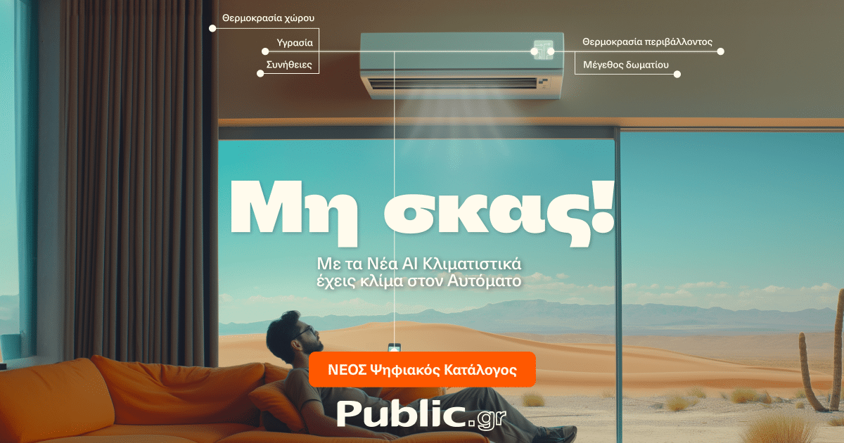 Τι και εάν έξω σκάει ο τζίτζικας, τι και εάν 40 βαθμοί λιώνει το κορμί, τι και εάν αισθάνεστε τον λίβα που καίει τα σπαρτά… δεν χρειάζεται να καθυστερείτε άλλο μπείτε τώρα στον e-catalogue του Public για air-condition και το μόνο σίγουρο είναι ότι δεν θα… ιδρώσετε καθόλου!