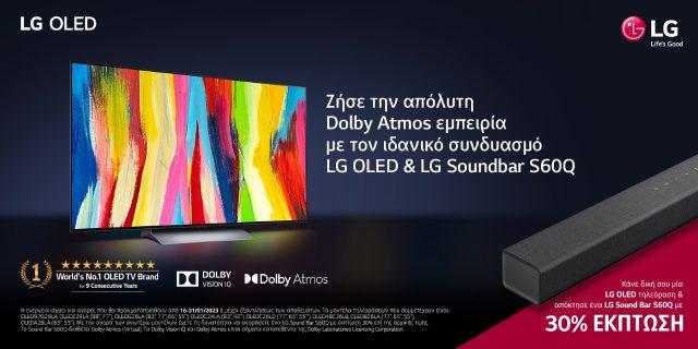 Η LG Hellas δίνει, με την αγορά μιας τηλεόρασης LG OLED, από σήμερα, 16 Ιανουαρίου και μέχρι 31 Ιανουαρίου ή μέχρι εξάντλησης των αποθεμάτων, έκπτωση 30% στην αγορά ενός LG soundbar S60Q, για να μπορούν οι καταναλωτές να απολαμβάνουν την απόλυτη εμπειρία Dolby Atmos®, αναβαθμίζοντας την οικιακή τους ψυχαγωγία. Η προσφορά ισχύει για την αγορά τηλεόρασης LG OLEDG2 (97,83,77,65 & 55 ίντσες), LG OLEDZ2 (88 & 77 ίντσες), LG OLEDC2 (42, 48, 55, 65, 77 & 83 ίντσες), LG OLEDB2 (55, 65 & 77 ίντσες) ή LG OLEDA2 (55 & 65 ίντσες).
