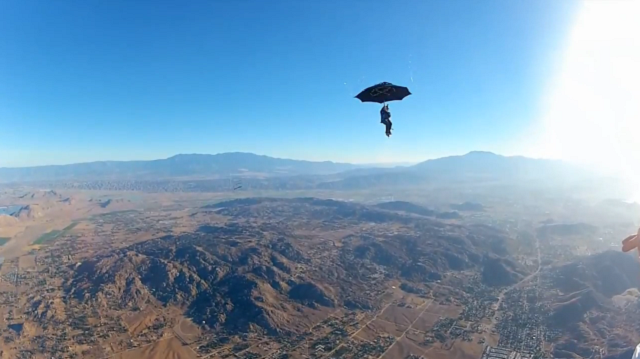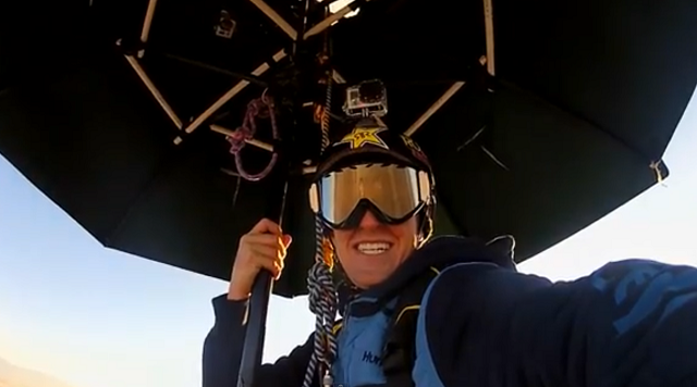 Και κάπως έτσι, έπεσε από ένα αερόστατο με τη βοήθειά της, καταγράφοντας το όλο σκηνικό με GoPro κάμερα. Η ομπρέλα μπορεί να έσπασε μέσα σε 10 δευτερόλεπτα, αναγκάζοντάς τον να χρησιμοποιήσει το εφεδρικό του αλεξίπτωτο, έστω και για λίγο το θέαμα στον ουρανό όμως ήταν εντυπωσιακό.