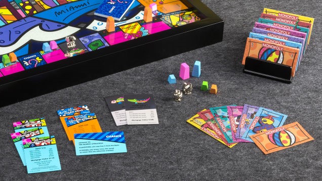 Αντί του κλασικού αναδιπλούμενου ταμπλό, η Μονόπολη Μαϊάμι αποτελείται από ένα βαθύ ξύλινο κουτί με γυάλινη επιφάνεια πάνω από το ταμπλό. Ακόμη, τα έξι πιόνια και όλες οι κάρτες έχουν υποστεί τις αλλαγές του Britto. Δεν θα μας πειράξει αν καταλήξουμε στην φυλακή, αφού μοιάζει με γκαλερί έργων τέχνης.