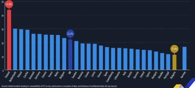 Στον αντίποδα, τα ευρωπαϊκά κράτη με τα περισσότερα κρούσματα ήταν η Φινλανδία όπου σχεδόν οι μισές επιχειρήσεις, (το 43,8%,) δέχτηκαν τουλάχιστον μία κυβερνοπίθεση στη διάρκεια του 2022. Μεταξύ των χωρών της ΕΕ με τα υψηλότερα ποσοστά εταιρειών, που κατέγραψαν περιστατικά ασφάλειας και παραβίασης των συστημάτων τους, ήταν η Ολλανδία και η Πολωνία με 30,1% και 29,7% αντίστοιχα. Ακολουθούν η Τσεχία με 29,3% και η Δανία με 26,4% αντίστοιχα.