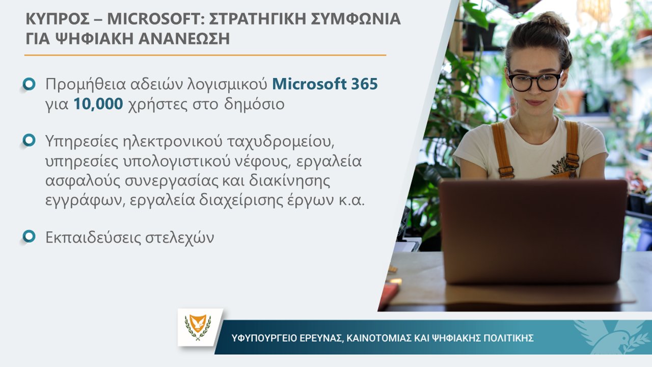 Enterprise Agreement για τον ψηφιακό εκσυγχρονισμό και την βελτίωση της αποδοτικότητας της κρατικής μηχανής, ύψους 8 εκατομμυρίων ευρώ, σύναψε το Υφυπουργείο Έρευνας, Καινοτομίας και Ψηφιακής Πολιτικής με την αμερικανική εταιρεία Microsoft.