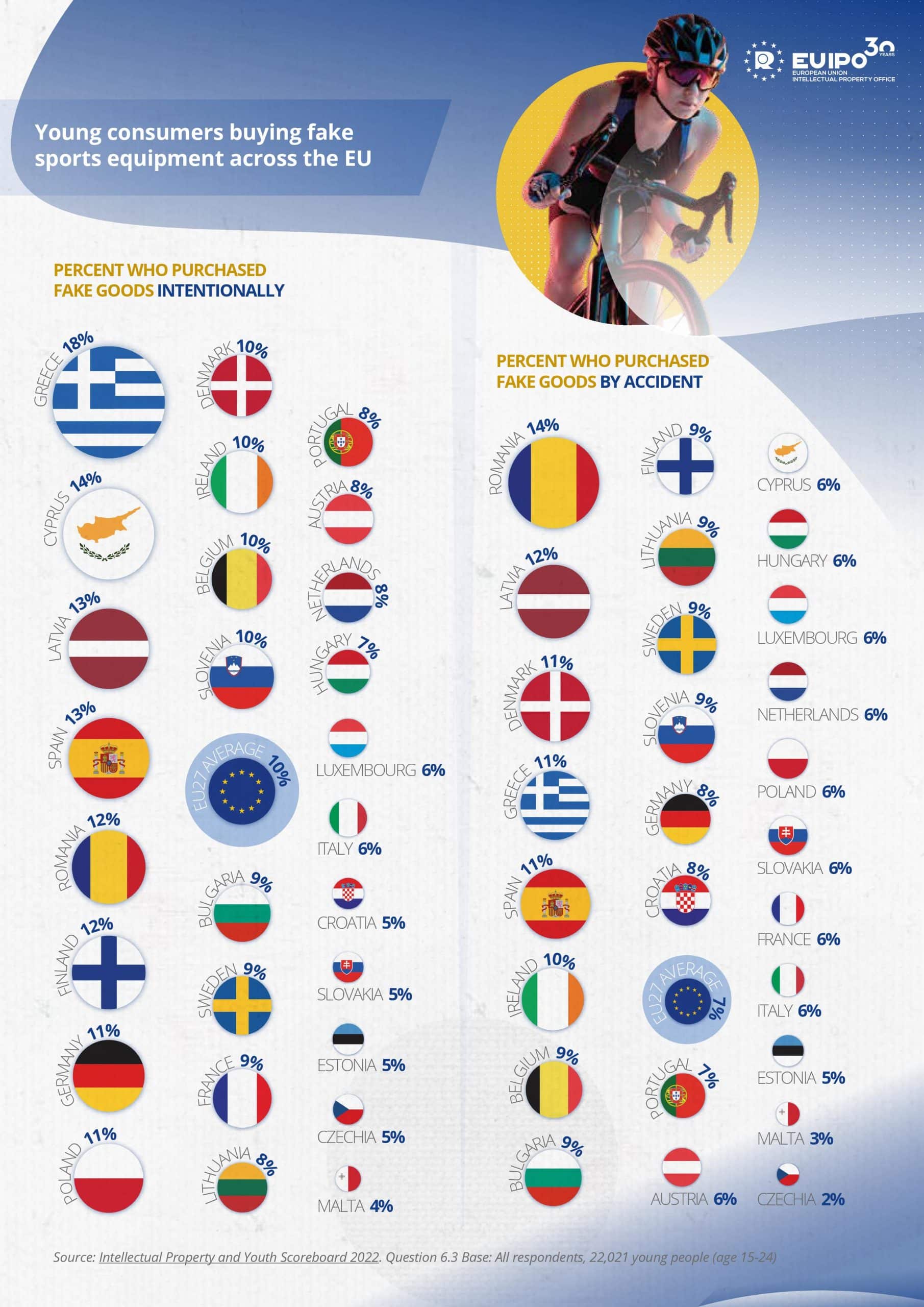 Ειδικότερα, σε ότι αφορά τα προϊόντα απομίμησης, η Κύπρος καταλαμβάνει ακόμη χειρότερη θέση στην κατάταξη, καθώς βρίσκεται στη δεύτερη θέση (πίσω από την Ελλάδα) με το ποσοστό των νέων κυπρίων ηλικίας 15-24 ετών που αγόρασαν εν γνώσει τους προϊόντα παραποίησης/απομίμησης αθλητικού εξοπλισμού στο διαδίκτυο, να αγγίζει το 14% ενώ στην Ελλάδα που κατέχει την αρνητική πρωτιά το αντίστοιχο ποσοστό είναι στο 18%.