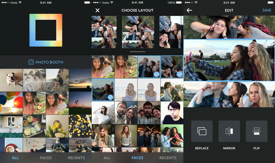 Με το Layout app ο χρήστης μπορεί να ενώσει έως και 9 φωτογραφίες σε μία, έχοντας για εργαλεία την επιλογή του layout που του αρέσει, την τοποθέτηση φωτογραφιών όπως του αρέσει, καθώς και επιλογές για περιστροφή, αναστροφή, καθρέφτισμα και μεγέθυνση των φωτογραφιών.