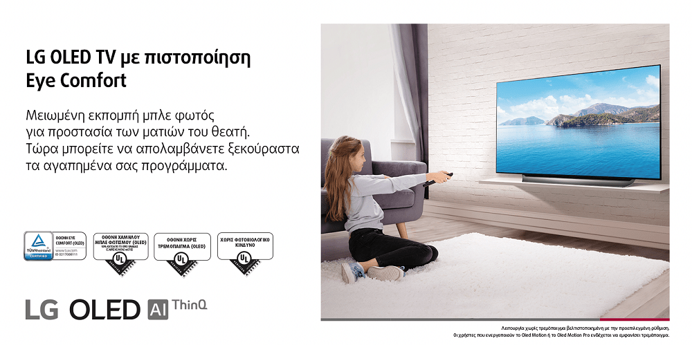 Οι OLED τηλεοράσεις της LG προσφέρουν ανώτερη ποιότητα εικόνας, χωρίς χρωματικές αλλοιώσεις και αυτό αποδεικνύεται από τα προηγμένα χαρακτηριστικά τους και την πιστοποίηση ασφαλείας που έχουν λάβει όσον αφορά στην προστασία της όρασης. Με την ενσωματωμένη λειτουργία Eye Comfort, οι χρήστες απολαμβάνουν πιο άνετη και ξεκούραστη εμπειρία θέασης.