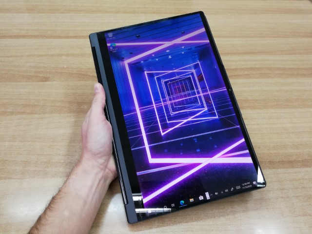 Κύριο χαρακτηριστικό του Yoga 9i είναι η οθόνη του που περιστρέφεται έως και κατά 360 μοίρες σχεδόν, έτσι το καθιστά… γνήσιο Yoga, με δυνατότητα χρήσης σαν τυπικό notebook, σε tent mode αλλά και σαν ένα τεράστιο tablet. Μάλιστα, το hinge είναι ταυτόχρονα και η soundbar της συσκευής, για την οποία θα μιλήσουμε στη συνέχεια.