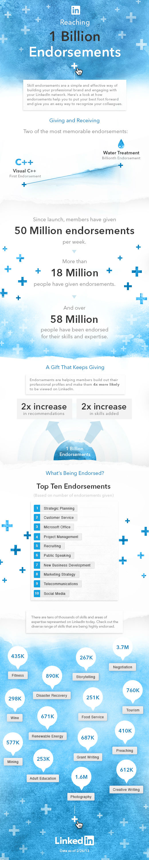 Η λειτουργία αυτή μοιάζει περισσότερο σαν ένα παιχνίδι για τους χρήστες, οι οποίοι κατάφεραν συνολικά να ξεπεράσουν το 1 δις Endorsements (Εγκρίσεων) σε λιγότερους από 6 μήνες. Συγκεκριμένα, περίπου 50 εκ. Endorsements γίνονται κάθε βδομάδα και συνολικά 18 εκ. χρήστες έχουν κάνει Endorsement σε κάποια δεξιότητα άλλου χρήστη και 58 εκ. χρήστες έχουν δεχτεί έστω κι ένα Endorsement σε κάποια δεξιότητα τους.
